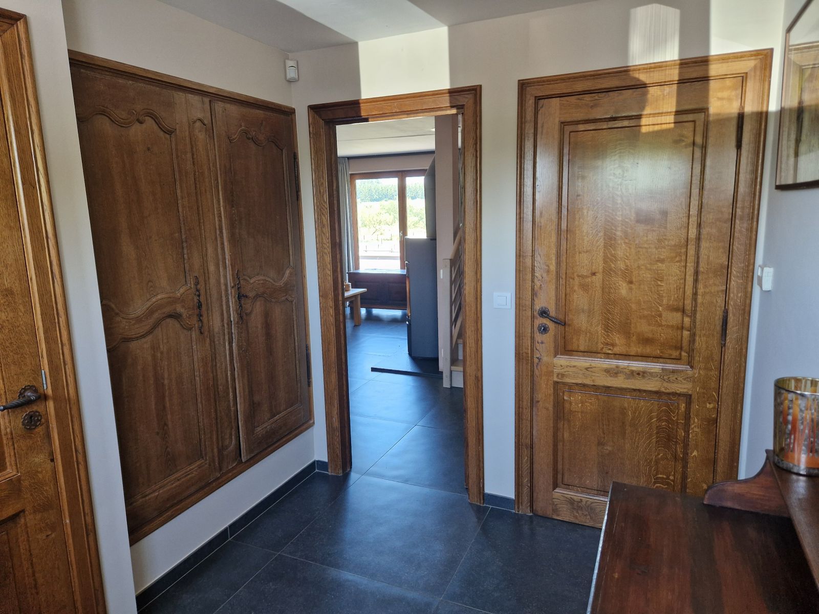 L’étage compte 4 spacieuses chambres avec parquet massif et espace dressing intégré, un spacieux pallier avec placard/dressing modulable en bureau, un coin débarras/salle de repassage et une superbe salle de bain (douche à l’italienne, baignoire, wc, meuble lavabo double vasque).