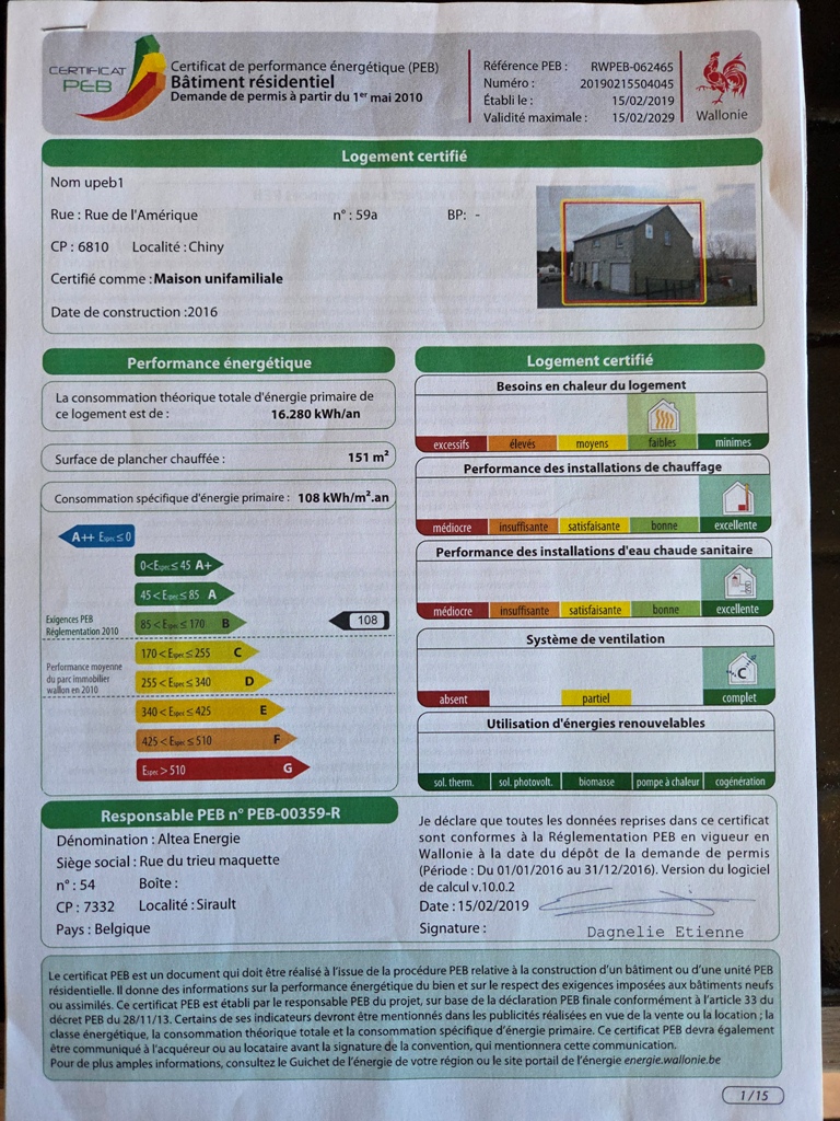 PEB n°RWPEB-062465 - E spec : 108 KWh/m².an