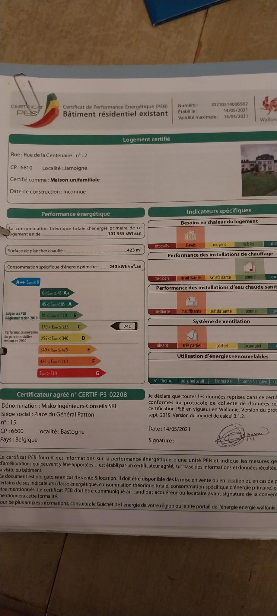 PEB n°20210514006562 - E spec : 240 KWh/m².an